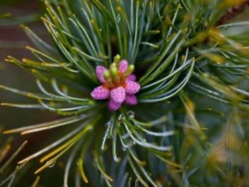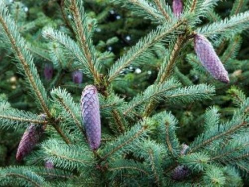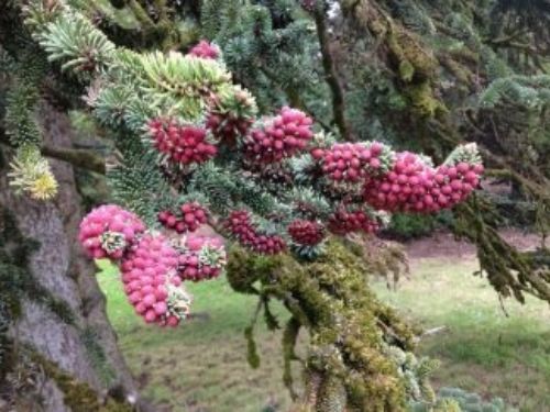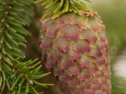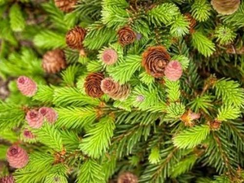 Picea abies 'Acrocona' has pink-tipped terminal seed cones