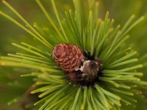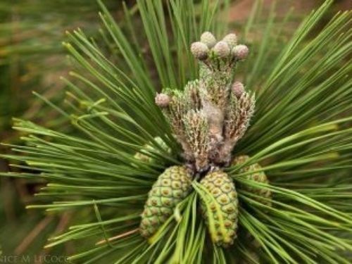 Pollen cones, since they do not have to provide a home for the developing seed, are by their nature smaller than seed cones. That doesn't mean that they can't attract attention, though! Check out the pollen cones on Japanese white pine, in this case, a cultivar called 'Cleary':