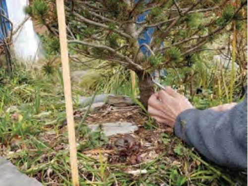 The conifer, P. sylvestris at home: some black dots on stems (more signs of the disease)