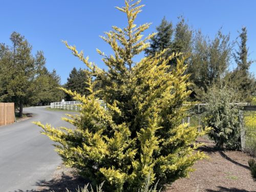 Cupressus nootkatensis 'Green Arrow' (Green Arrow Nootka cypress) in a garden in Northern California