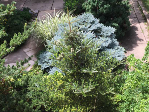 I had always been interested in conifers for their year-round interest, even drawing them when I was a young adult experimenting with various art forms. The first landscaping season at the condo left me with a greater interest in conifers. I spent a lot of time at our local Gethsemane Garden Center searching out the most beautiful conifers I could find that would grow slowly.