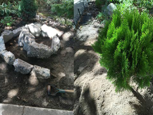 After getting permission to reimagine the plot, I proceeded to draw up plans for the southeast segment of the yard, which included conifers, flowering shrubs and natural hardscaping. One of my specialties, wherever I move, is to add hardscaping using rocks to create gardens.