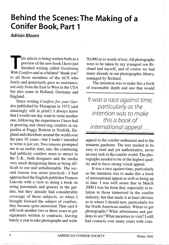 Enjoy our featured article celebrating the 40th Anniversary of the ACS. The article appeared in the Winter 2002 issue of the Conifer Quarterly and was authored by Adrian Bloom. Don't miss Adrian's virtual presentation of his new book "Foggy Bottom - A Garden to Share" on February 10.