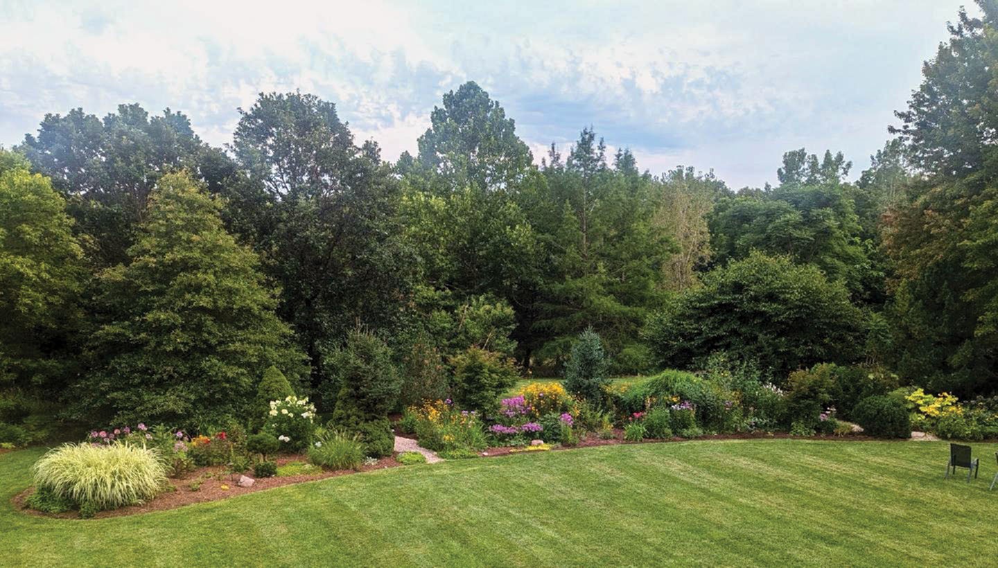 incorporated a variety of hardwood trees, shrubs, hostas, daylilies, and perennials.