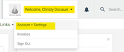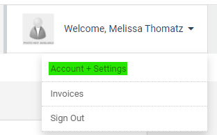 - Once signed in, access "Accounts + Settings" by clicking the down arrow next to your name at the top right of the screen.