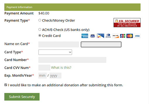 Selecting “I would like to make an additional donation after submitting this form” will open a secure donation form after the payment is submitted.